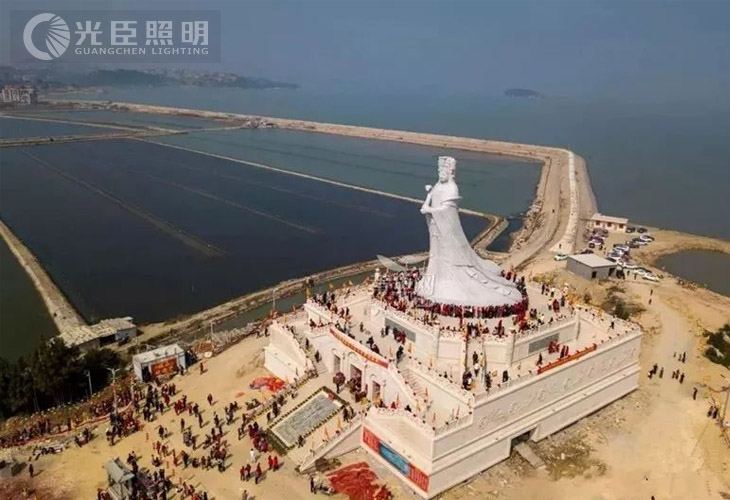 結合參照物體的亮化背景,媽祖像高度約30米左右,實現(xiàn)媽祖石像整體打亮,光臣照明為此定制一款晶元大功率400W投光燈,附加LED洗墻燈一批和小量藍光小射燈作為本次媽祖亮化燈具,在白總與光臣照明的同共努力下,效果呈現(xiàn)與設計方案效果還原度高達99%。