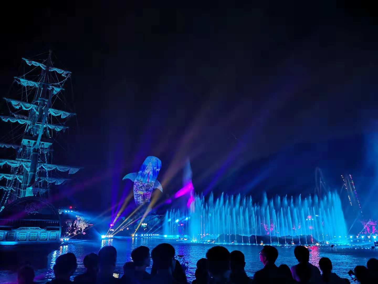 玩了一天,簡(jiǎn)單地吃過(guò)東西后,晚上欣賞燈光表演和煙花匯演。絢麗多彩的燈光秀結(jié)合煙花表演,洗去了大家的疲憊感。