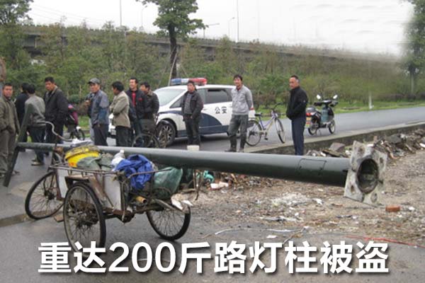 次年2010年3月,杭州濱江路上一男子用自己腳踏三輪車承載著正準備安裝的6米路燈燈柱,該燈柱重達200斤。幸好被周邊民眾圍堵后攔下來,隨后民警趕到現(xiàn)場。