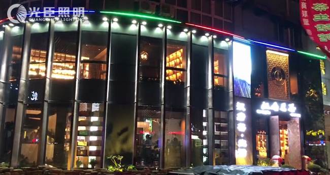 客戶希望做成全彩的效果,因此這里用到的是LED全彩八段線條燈做頂部輪廓,搭配窄光束投射燈對(duì)立柱打光,增強(qiáng)立體感,完成了本次亮化。