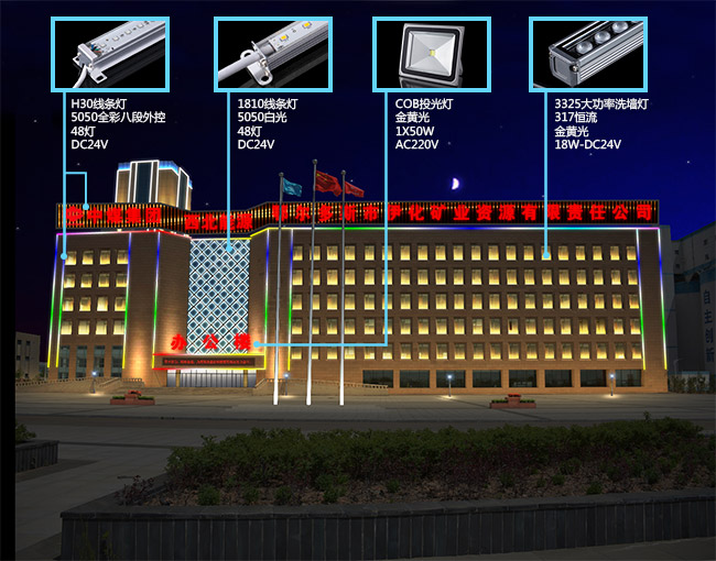 四、窗臺(tái)亮化方案:選用了250多米3325金黃光18W洗墻燈作為玻璃面投光燈具,窗臺(tái)部份可選用LED窗臺(tái)燈完成,客戶通過效果比對(duì)后,還是喜歡LED投光燈的亮化效果。