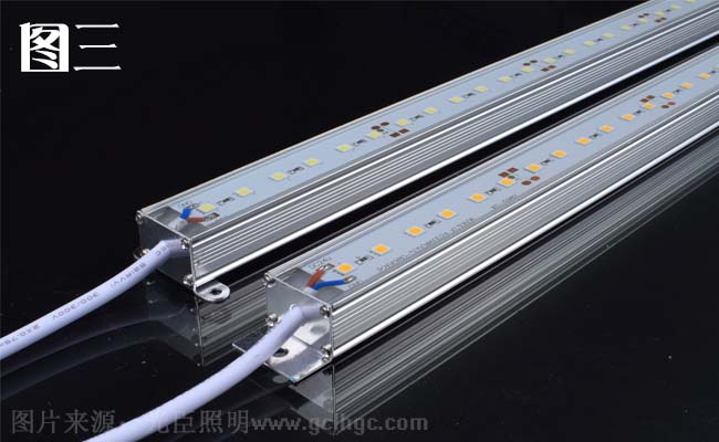 (三)堵頭出線:堵頭出線是從線條燈兩端堵頭片中間開一個(gè)出線孔,安裝非常方便。堵頭出線做不到無縫連接,美觀性相對(duì)于底部出線而言略為遜色。如圖三所示。