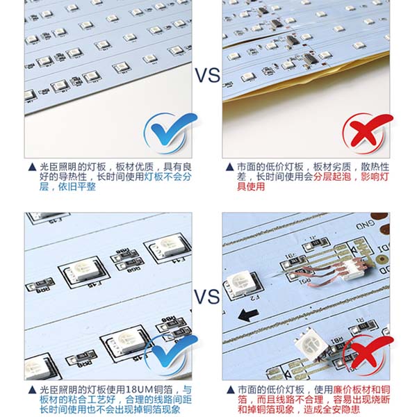 針對PCB板材的材質(zhì)來分析,PCB板也有分很多種質(zhì)量層次,市面上大部份廉價的線條燈選用的是二次料的PCB板材,這種板材在受熱后容易分層、銅箔太薄容易掉、粘合性不好銅箔層和PCB板層容易分開,更不用說線路穩(wěn)定性如何,板材都這樣還指望線路是穩(wěn)定的嗎?別開玩笑了,大家都很忙!大多數(shù)便宜的線條燈它沒有經(jīng)過合理的線路布局和檢驗測試去測評它的可靠性和穩(wěn)定性。而正規(guī)的LED線條燈廠家所生產(chǎn)出來的產(chǎn)品肯定會做到這一點才能在市面上銷售。