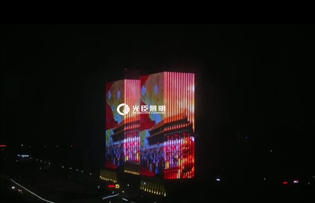 A、B雙子大樓夜景亮化主要以全彩線條燈做屏的形式,采用DMX512八段RGBW線條燈,合計(jì)一萬多米,縱向安裝。